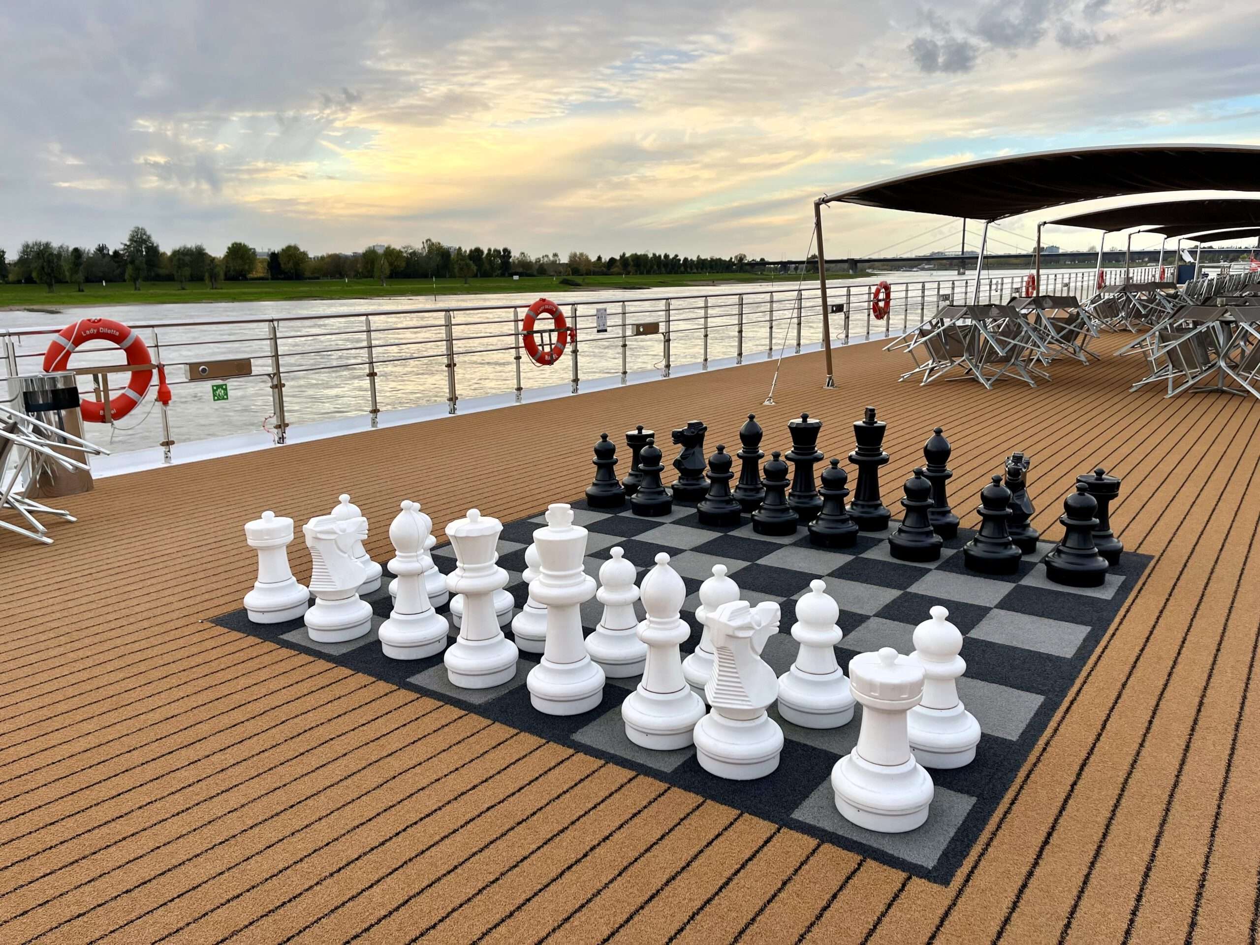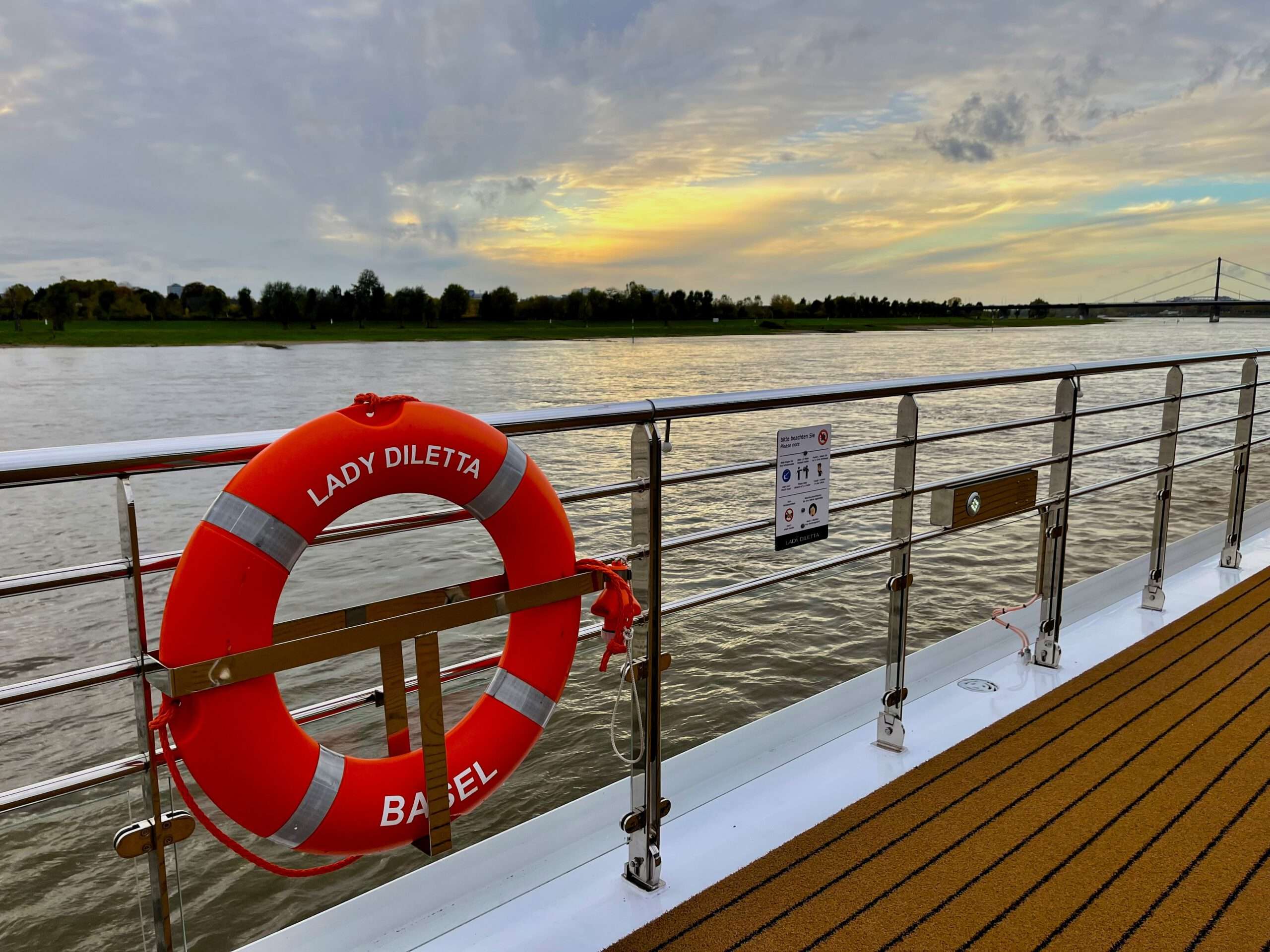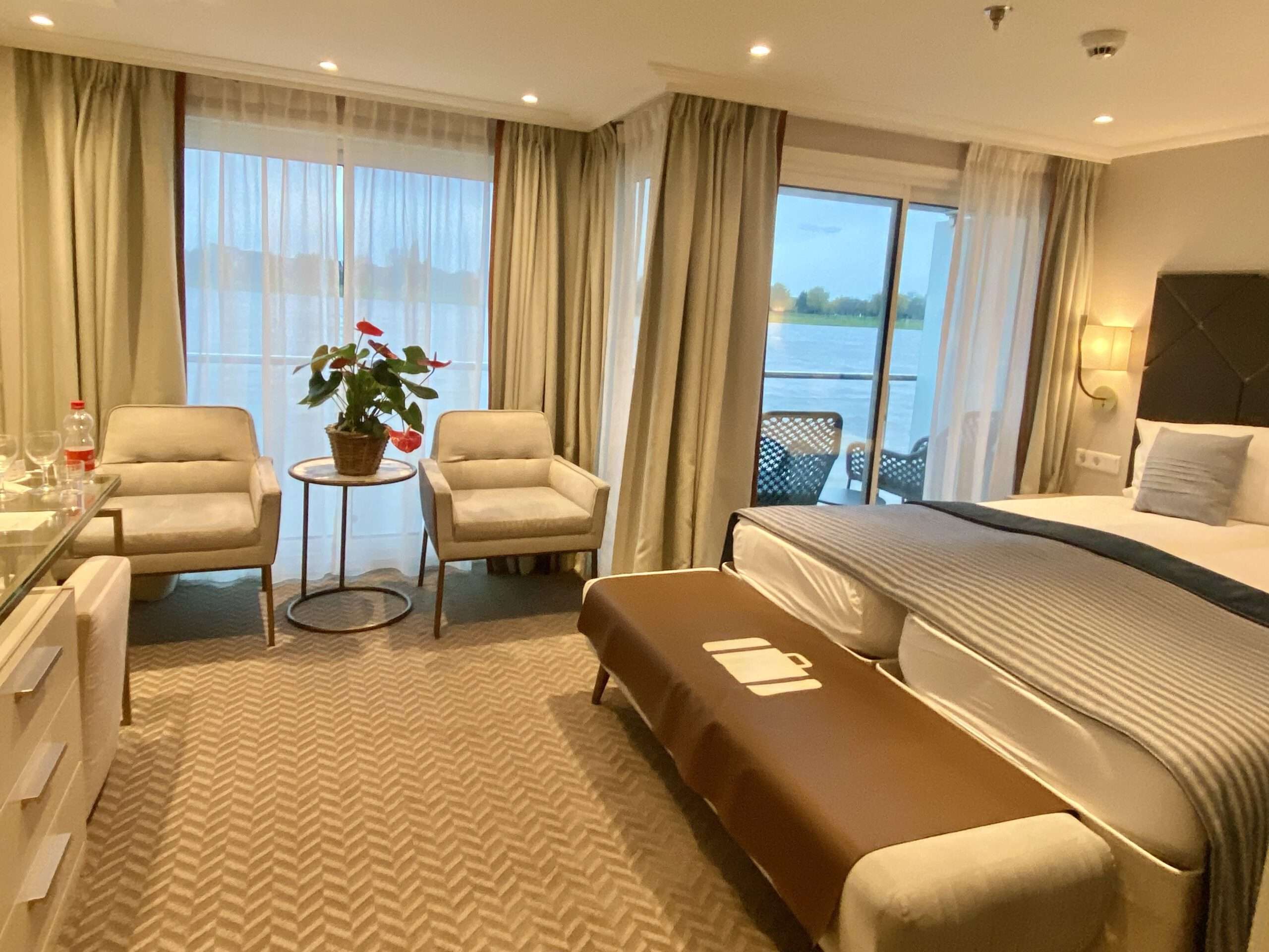 Eine Flusskreuzfahrt von Düsseldorf über den Rhein in die Niederlande ist besonders abwechslungsreich: viel Natur, kurze Wege, eine entspannte Fahrt und spannende Städte. Während die Lady Diletta flussabwärts gleitet, weitet sich die Landschaft, und bald macht sich das typisch niederländische Flair bemerkbar. Ich habe an Bord die Kabine 212 bezogen, eine Zweibettkabine mit französischem Balkon auf dem Rialto Deck und fühle mich dort direkt wohl. Das Panoramafenster bietet besten Blick auf das Wasser und die vorbeiziehende Landschaft. Das bedeutet echte Entschleunigung. Die 16 Quadratmeter groß Kabine ist schick, modern und vor allem auch sehr gemütlich. Auch das Bad ist hübsch und durch eine Schiebetür vom Rest der Kabine getrennt. Was mir in der Kabine fehlt, ist eine Kaffeemaschine, denn auch wenn es in der Lounge einen Kaffeeautomaten gibt, der rund um die Uhr zugänglich ist – morgens wach zu werden, eben auf den Knopf drücken und im Bett den ersten Kaffee zu trinken, das ist mir heilig.