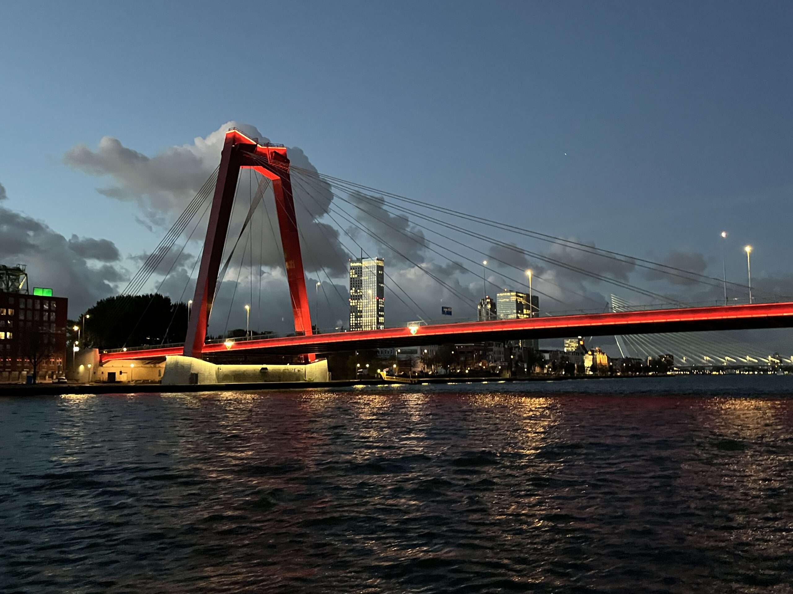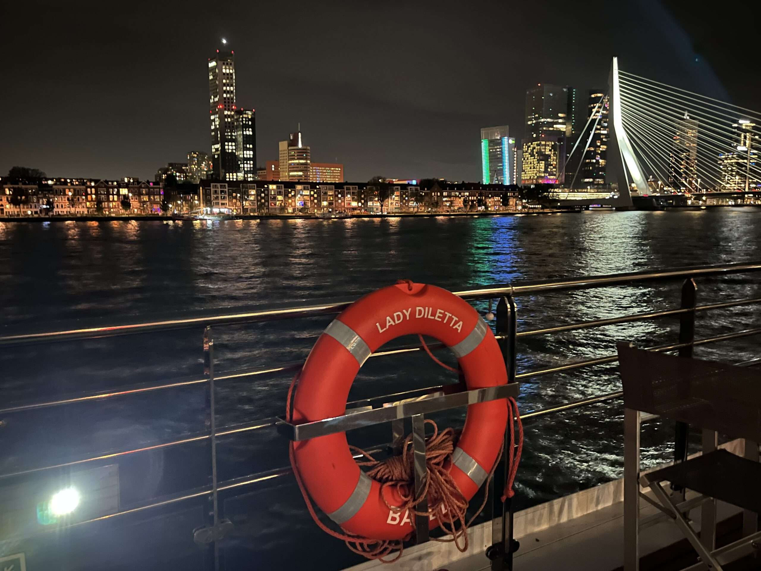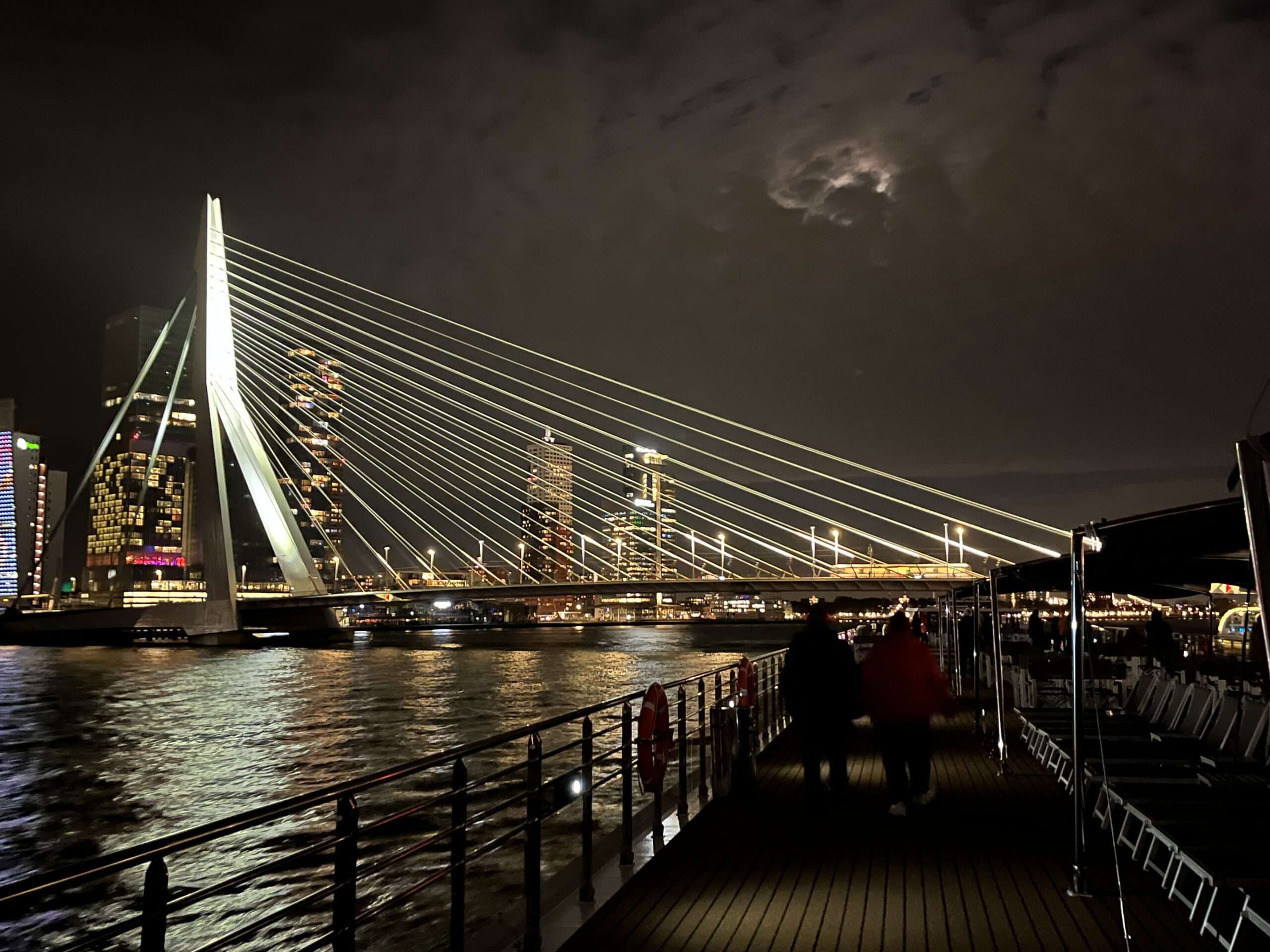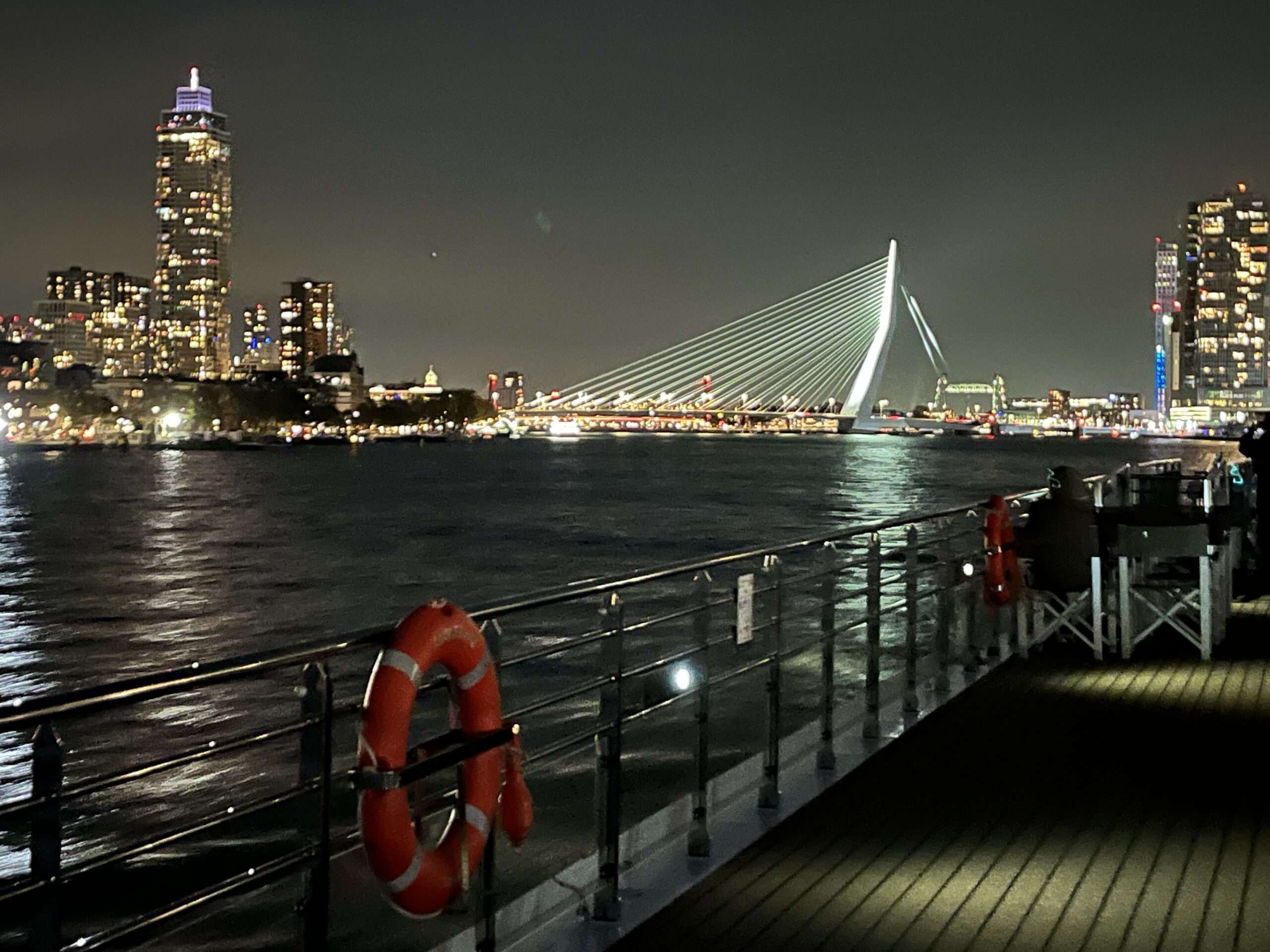 Nach der Stippvisite auf dem kleinen Hochseeschiff, das Platz für maximal 400 Passagiere bietet, nehmen wir das Wassertaxi zurück zu unserer Lady. Ich entschließe mich, nach dem Mittagessen zu den Kubushäusern zu gehen und in der kunstvollen Markthalle gemütlich einen Kaffee zu trinken. In den Abendstunden verlassen wir Rotterdam Richtung Nijmegen, aber vorher wartet noch eine Überraschung auf die Passagiere: eine Lichterfahrt durch Rotterdam. Fast alle Gäste ziehen sich warme Jacken an und genießen die Fahrt durch die Stadt. Besonders faszinierend sind die beleuchtete Erasmusbrücke und die Willemsbrug.