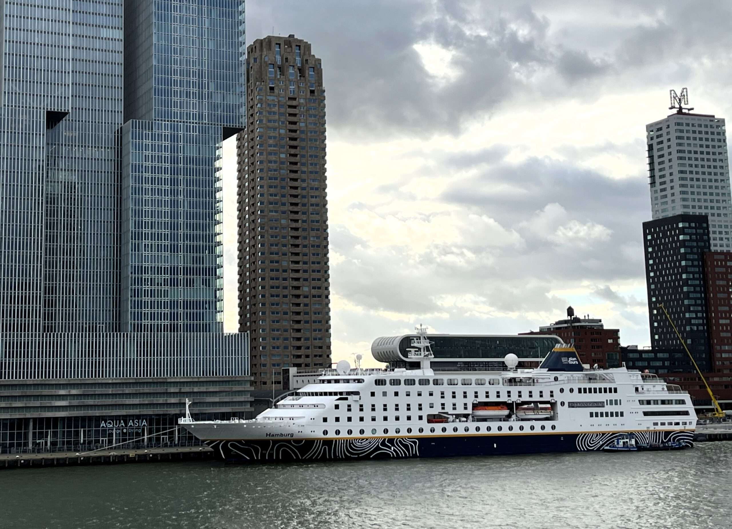 Ein starker Kontrast dazu ist Rotterdam, das nach seiner Zerstörung im Zweiten Weltkrieg zu einer der modernsten Städte Europas geworden ist. Kühne Architektur prägt das Stadtbild: die markanten Kubushäuser, die elegante Erasmusbrücke und die imposante Markthalle stehen sinnbildlich für den Mut zu neuen Formen. Als einer der größten Häfen der Welt ist Rotterdam zudem stark maritim geprägt; eine Hafenrundfahrt eröffnet faszinierende Einblicke in das geschäftige Treiben zwischen Containerriesen und Werften. Dieser Tag ist für mich der schönste der Kurztour mit der Lady Diletta, denn mit uns im Hafen liegt auch das Hochseeschiff von Plantours, die MS Hamburg. Ich frage unseren Kreuzfahrtdirektor, ob ich eventuell für eine Schiffbesichtigung rüber kann, und das funktioniert tatsächlich. Die MS Hamburg liegt auf der anderen Seite der Erasmusbrücke, zusammen mit unserem Kreuzfahrtdirektor mache ich mich auf den Weg.