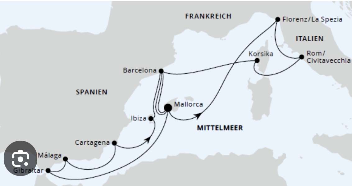 Unsere Route ist spannend: von Mallorca aus geht es nach Gibraltar, Malaga, Cartagena, Ibiza, Barcelona und wieder zurück nach Mallorca. Dort ist Wechseltag, das heißt, die Mehrzahl der Passagiere steigt ab und neue steigen auf. Wir haben das Glück und bleiben eine zweite Woche. Hier geht es zunächst nach La Spezia, dann nach Rom, Korsika und über Barcelona wieder zurück nach Mallorca. Ihr seht, es sind zwei Wochen mit wunderschönen Destinationen, die unterschiedlicher nicht sein könnten.