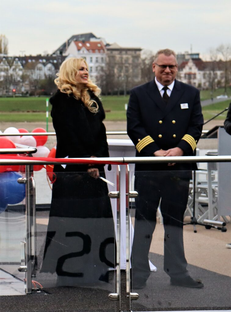 Taufpatin Sonya Kraus hat ihre Aufgabe toll gemeistert. Sie ist am Tauftag zum ersten Mal an Bord eines Flusskreuzfahrtschiffes und hat sich nun vorgenommen, zusammen mit ihrer Mutter eine Mosel-Kreuzfahrt zu machen. Der Funke ist also übergesprungen. Zuvor war sie dreimal beruflich für Dreharbeiten auf Kreuzfahrt, allerdings waren das Hochseekreuzfahrten.